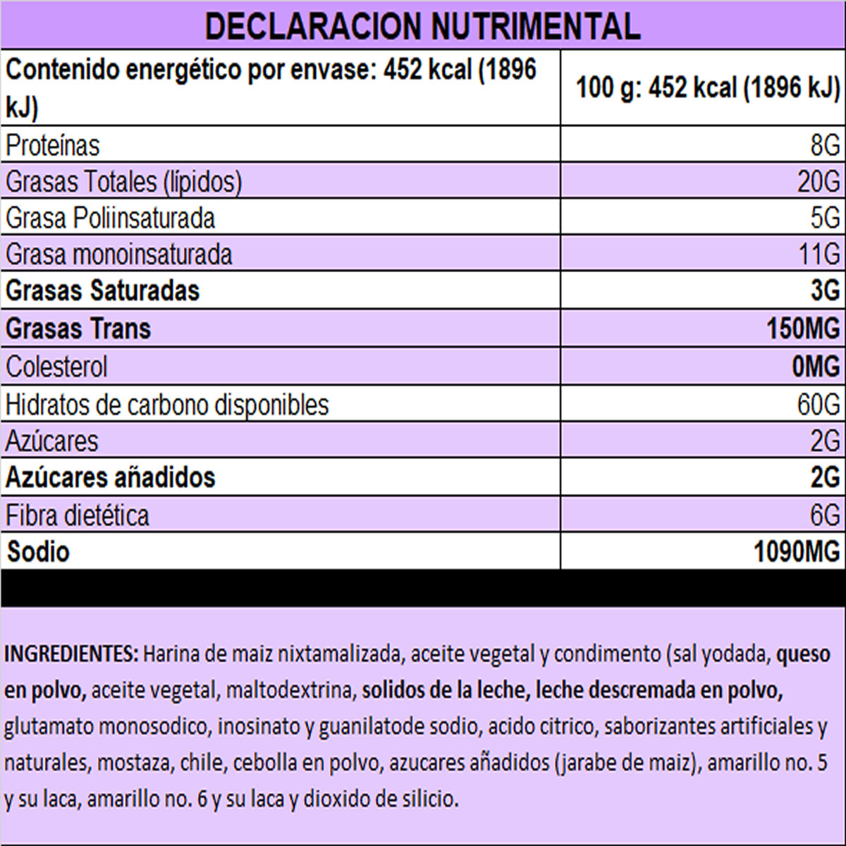 Sabor Principal: Esquite Tradicional. Sabor a elote, mantequilla, queso y un toque de chile/epazote.