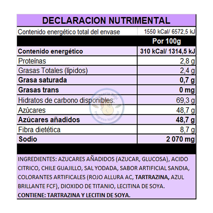 Ingredientes: Azúcar, jarabe de maíz, pulpa de sandía, chile en polvo, ácido cítrico, sal, colorantes y saborizantes artificiales 🧂🌶️🍉